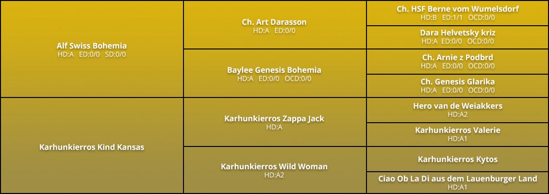° 18 January 2022HD:A ED:0/0 SD:0/0ECVO test: OK Vader - Sire: Alf Swiss BohemiaMoeder - Dam: Karhunkierros Kind Kansas